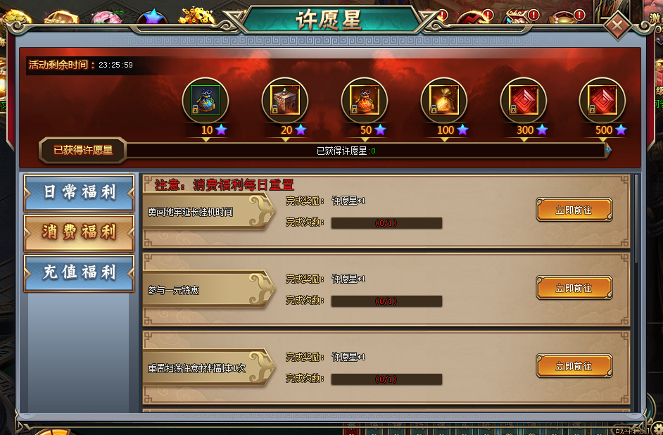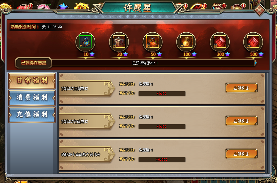 1. 活动期间,玩家可通过完成目标任务或者充值,获取许愿星