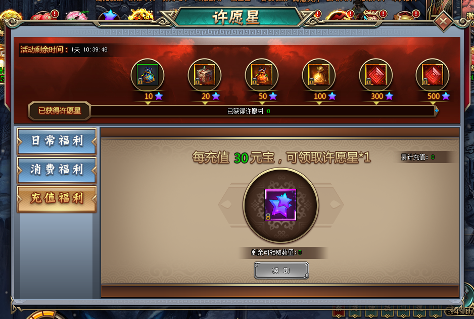 1. 活动期间,每充值30元宝,可领取许愿星*1