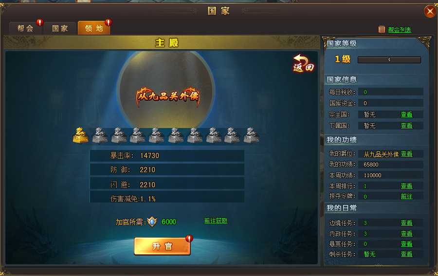 主殿:可用功绩升级爵位,提升战力同时获得稀有属性伤害减免!同时功绩会升级国家等级!