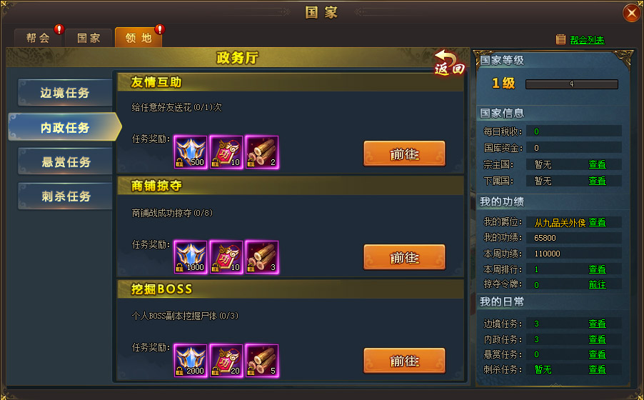 政务厅:领取边境任务和内政任务,完成任务获得功绩!