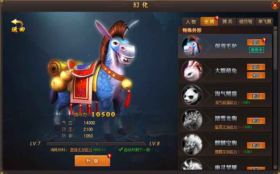 3.新增幻化强化功能:已经幻化过的坐骑、骑兵、破月弩和单飞翼可以通过消耗对应的幻化碎片升级,提升战斗力!