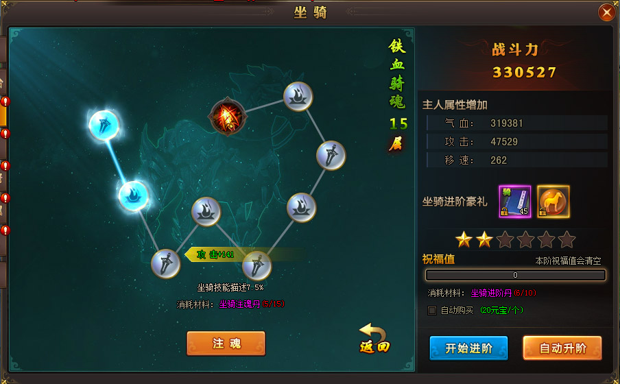 坐骑、骑兵、破月弩和单飞翼升级阶数达到6阶时分别独立开启,开启后在对应界面中出现注魂按钮,进入后升级灵脉获得人物属性和战斗力,灵脉突破后还可以获得封印对手对应系统技能和属性的技能(例:骑兵注魂技能触发将封印对手骑兵的技能和属性!)