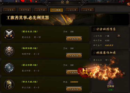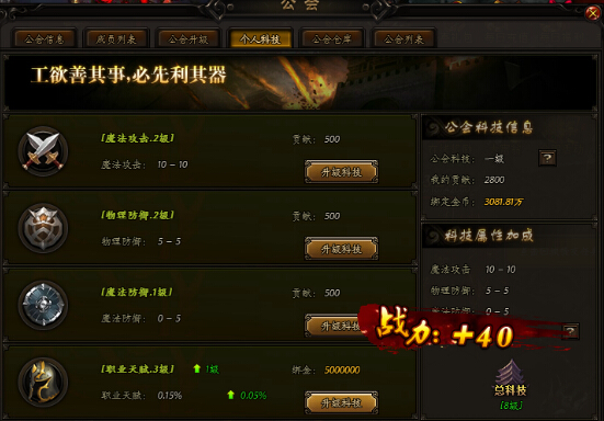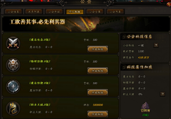 “工欲善其事,必先利其器”这就是傲天赤月传说2传说中公会科技中的个人科技,个人等级上限取决于公会科技等级。目前个人科技可升级的属性包括:对应职业的攻击、物理防御、魔法防御、职业天赋,升级个人科技需要消耗个人公会贡献。