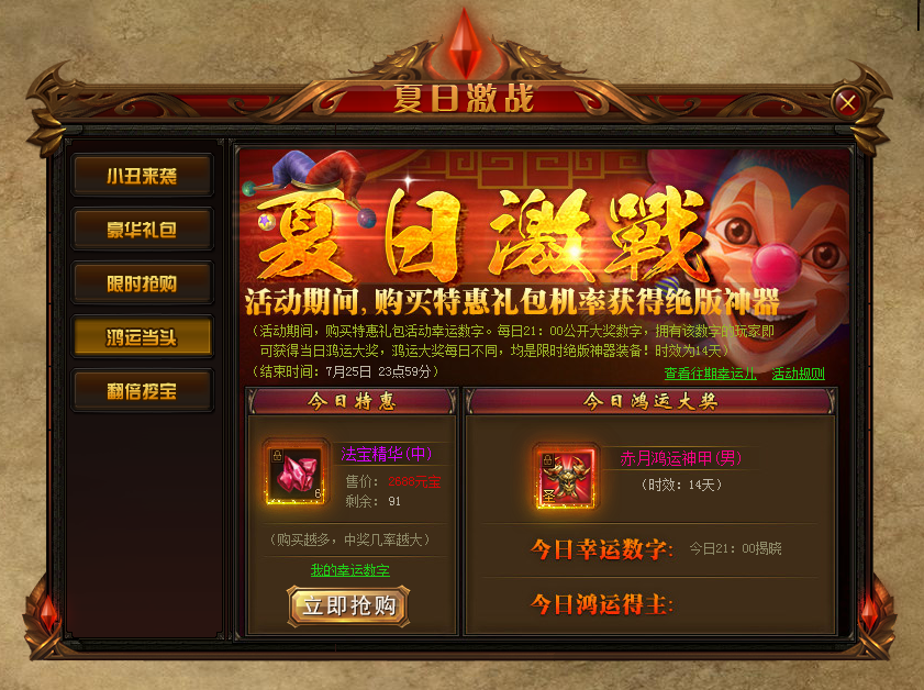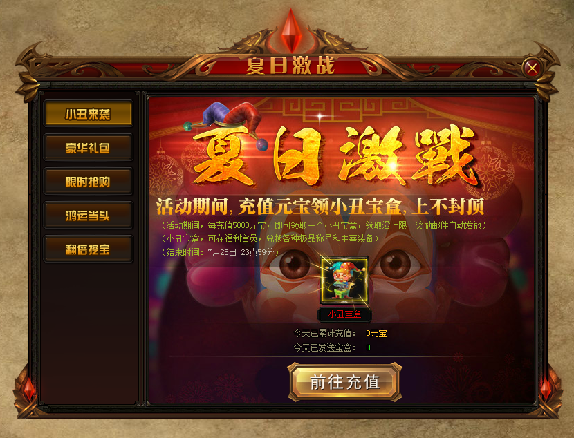 1.激战活动期间每充值5000元宝可通过邮件领取到小丑盒子一个,小丑宝盒领取无上限