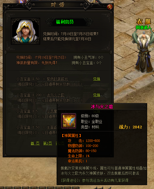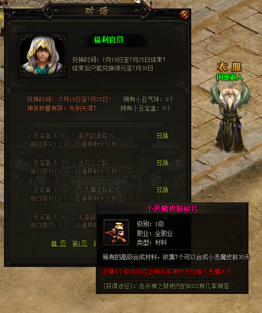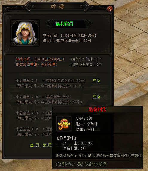 2.宝盒可在福利官处兑换稀有道具:愚你同乐永久称号、冰与火之歌翅膀、小恶魔皮肤碎片