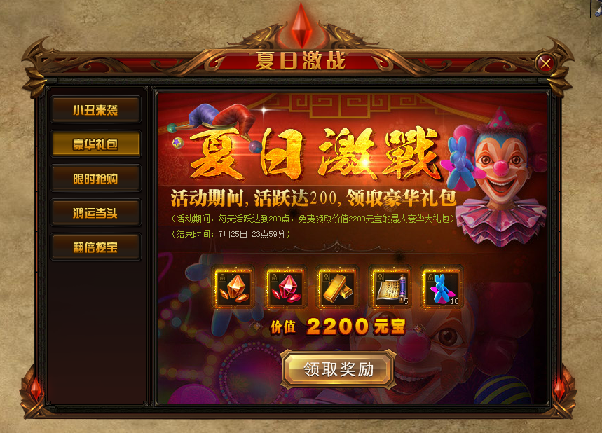 1.夏日激战活动期间活跃值达200点以上玩家即可免费领取价值2200元宝的节日豪华礼包