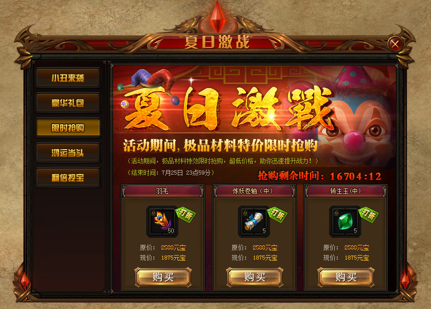 1.夏日激战活动期间,诸多极品道具限时打折出售,超低的购买价格,助您快速提升战斗力