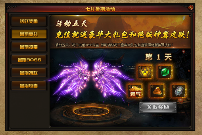 1、暑期活动期间,玩家的每天充值7288元宝即可免费领取堕落天使之翼碎片和豪华礼包。