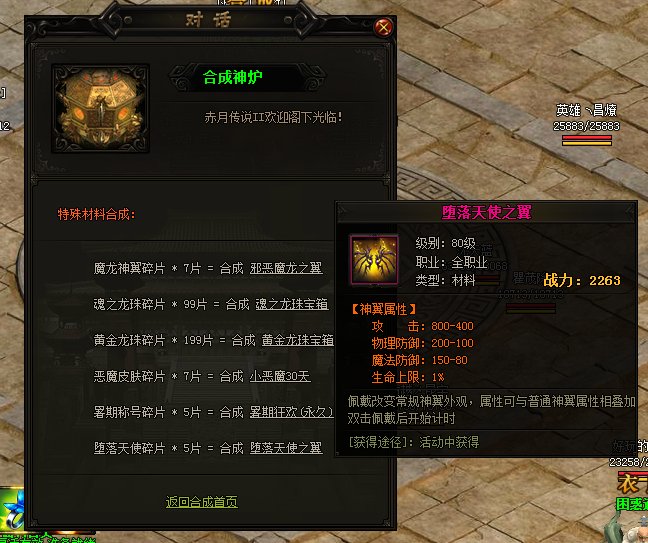 2、累计获得堕落天使之翼碎片5个,即可在合成神炉处合成神翼皮肤-堕落天使之翼。