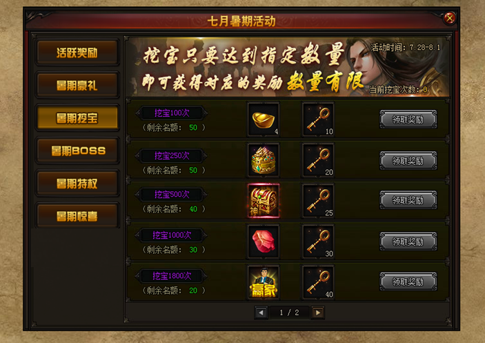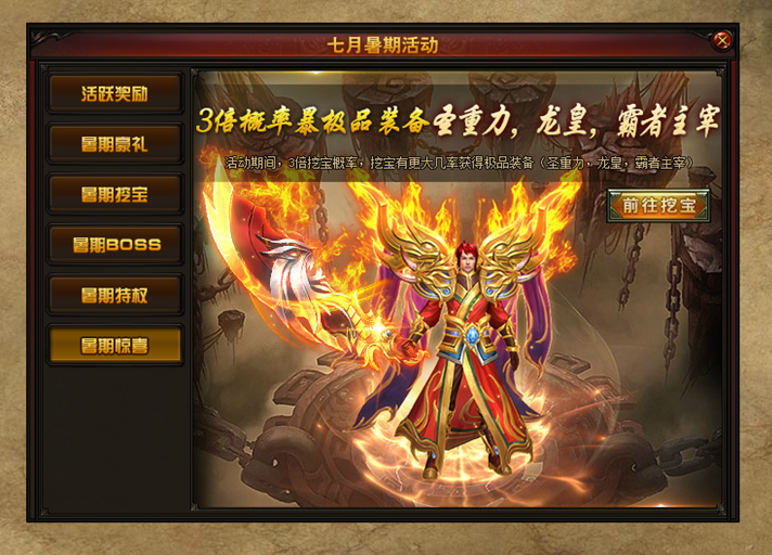 1、暑期活动期间,参与幸运挖宝活动有几率挖到稀有装备龍皇神装,机会难得,不容错过