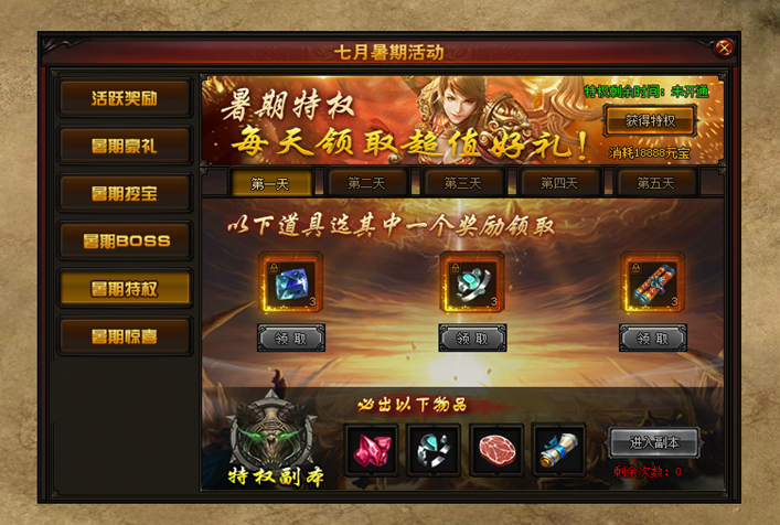 1、活动期间,可在获得界面购买暑期5日特权,每日可领取极品道具,还能挑战特权副本。