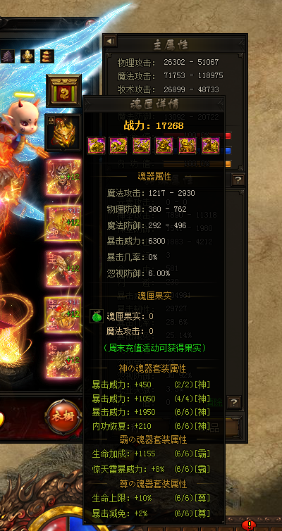 3. 穿戴6件至尊魂器更可以激活套装属性,增加人物大量的生命值和暴击减免的特殊属性。