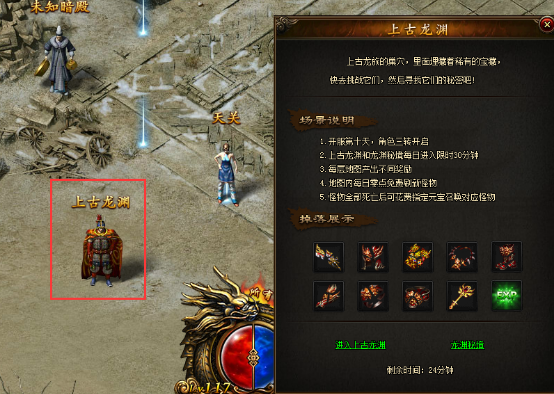 1.开服第10天、角色3转开启角色附灵功能,可通过热砂荒漠—天关NPC左侧—上古龙渊NPC选择进入上古龙渊或龙渊秘境,每日可进入30分钟,请合理安排时间进入。