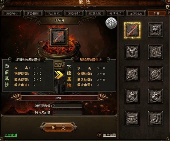 2.可从锻造-附灵界面对自身配带装备部位进行附灵,提升配带装备的指定基础属性百分比!配带装备越好,附灵属性越高!