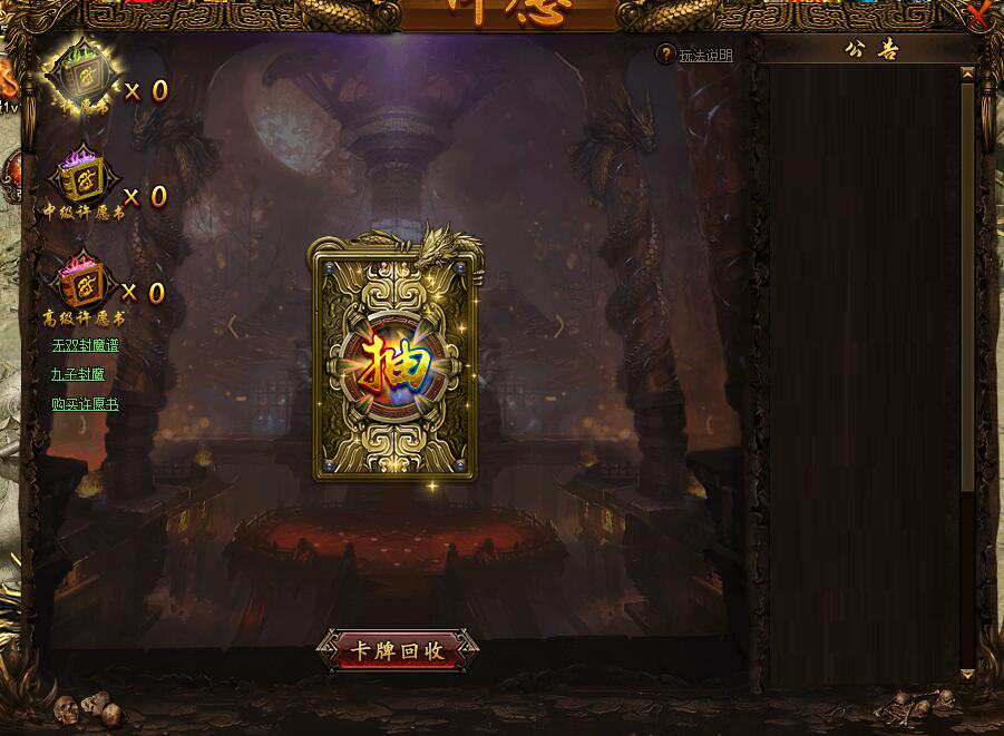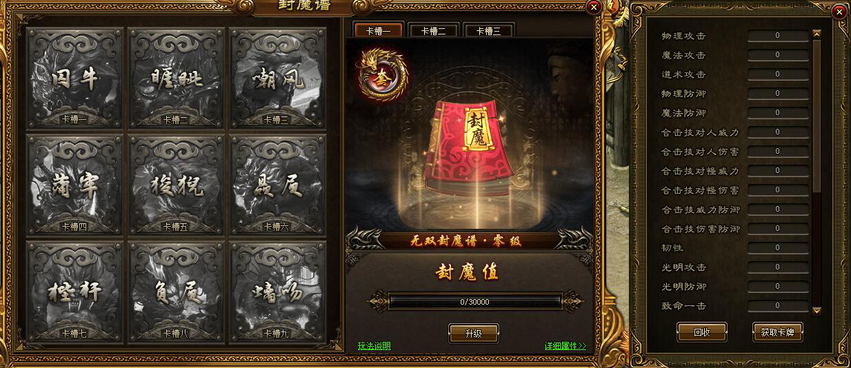 1.开服第3天,角色75级开启许愿书和封魔系统,玩家可在此系统抽取超稀有封魔卡牌,获得超高属性,羡煞旁人!