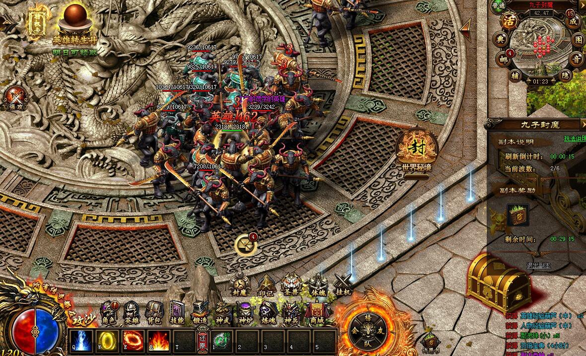 2.开服第3天,角色75级开启九子封魔副本,勇士们可协助九子封印魔王获得奖励!每天可进入2次,有效时间内击杀所有BOSS还可开启封印宝箱!