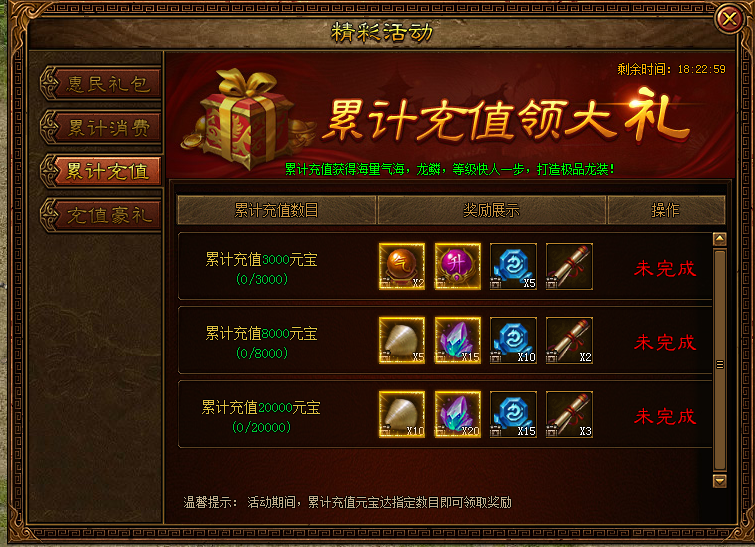 活动内容:活动期间达到累计充值即可领取奖励,可领取奖励有:龙鳞、点金石、符石、高级气海修为丹、星魂、玛雅卷轴。