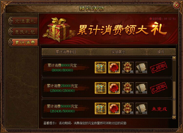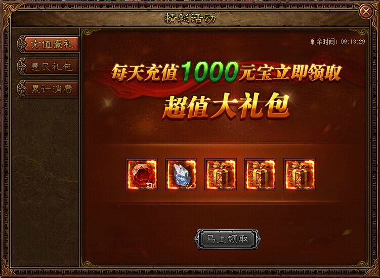 活动内容:活动期间达到累计消费即可领取奖励,可领取奖励有:龙牙、龙鳞、龙心、魔血精华、五星命星宝箱(攻、爆、防)、六星命星宝箱(攻、爆、防)、高级气海修为丹。