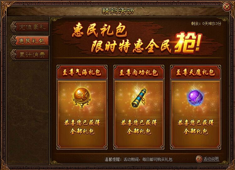 活动内容:活动期间特惠礼包每日共会出现3种不同的礼包,每种礼包可购买3个档次,且礼包内容根据不同的开服天数分为 开服前7天、开服第8天之后,,购买可获得大量优惠