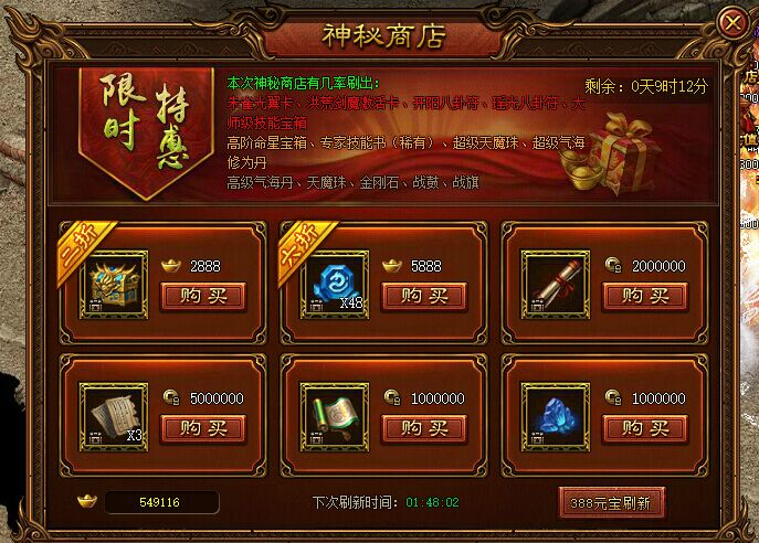 活动内容:活动期间神秘商店会刷新稀有道具,更有烛龙光翼、洪荒剑魔(男)、天魔·元古装宝箱、 开阳八卦符、瑶光八卦符、主宰矿石、卦象碎片、大师级技能宝箱、专家技能宝箱、主宰矿石、超级气海修为丹、星石、星魂、符石、光羽、玛雅卷轴、伏魔卷轴、技能书页、战神经验丹(大)、金刚石、高级天魔珠、光翼图纸等出售。