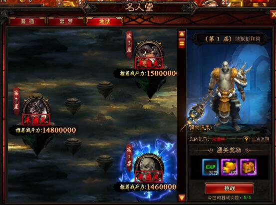 危险,绝对危险,弄不好小命立马丢掉。傲天决战武林中到底何处如此危险呢?那便是隐藏着江湖上头号危险人物的名人堂。如果说普通级名人堂是初级玩家噩梦的开始,那么噩梦级名人堂则是终极玩家的炼狱,至于地狱级名人堂更是战力上千万玩家的坟墓。正所谓“杀机四伏,处处凶险”,傲天决战武林游戏设置的地狱级名人堂到底有多危险?等你升到了上千万的战力,有能力打败地狱1层的彭和尚这个谜自然就解开了。