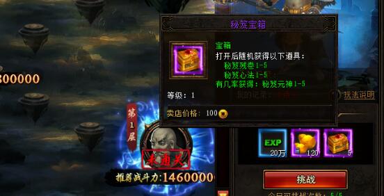 如果能顺利击败地狱彭和尚,就可以拿到秘笈宝箱、20万的经验值、120绑定元宝的奖励。光是开启秘笈宝箱1项,就可以拿到1~5张秘笈残卷和秘笈心法,同时还有几率获得傲天决战武林秘笈元神1~5个。