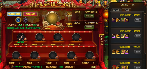 【活动内容】:活动期间,排行榜分为每日祝福榜以及祝福总榜,每个榜单又分为男女两个榜,玩家使用祝福卡即可提升祝福值,每日祝福值达到495即可进入每日榜前10,总榜祝福值达到990即可进入总榜前10,另外还有每日个人祝福值目标奖励