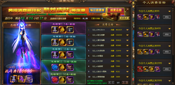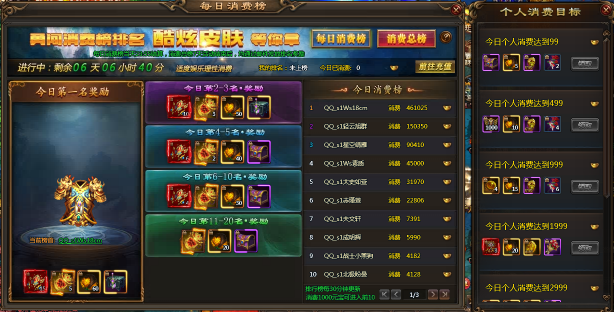 【活动内容】:活动期间,排行榜分为每日消费榜以及消费总榜,每日消费榜是每天进行结算,玩家每日消费达1000元宝即可进入每日榜的前10名,消费总榜是累计4天的总消费元宝进行排名,4天内消费达2000元宝的玩家即有机会进入前10名,另外还有每日个人消费奖励