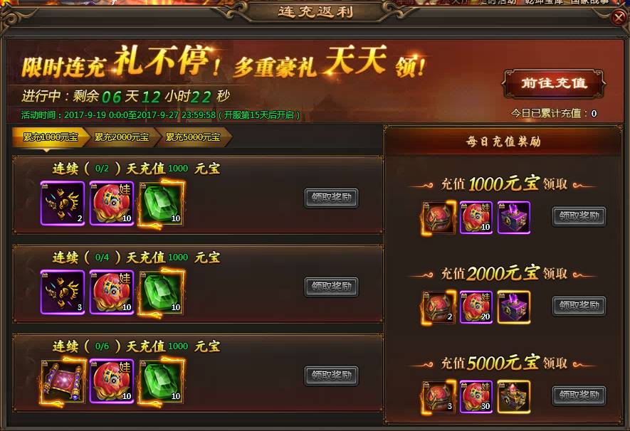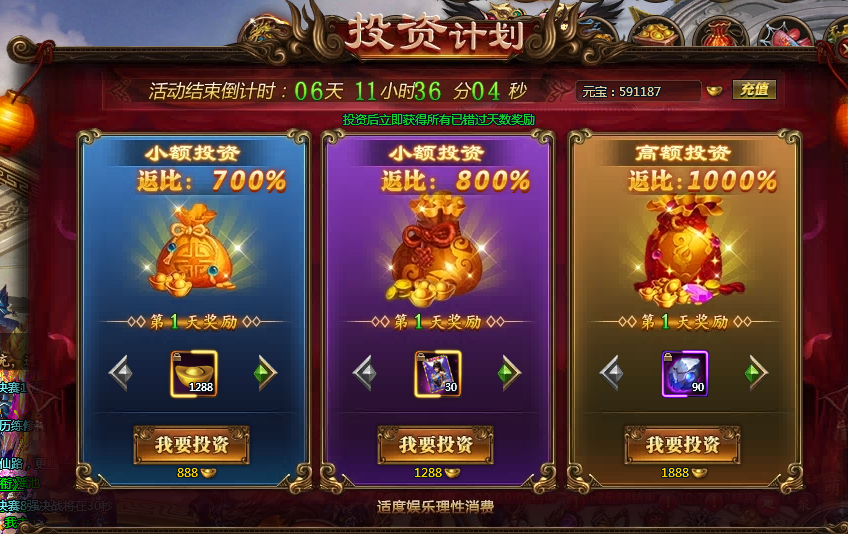 【活动内容】:活动期间,可进行投资获得返利,投资分为三个档次,投资对应档次后每日可领取不同的道具