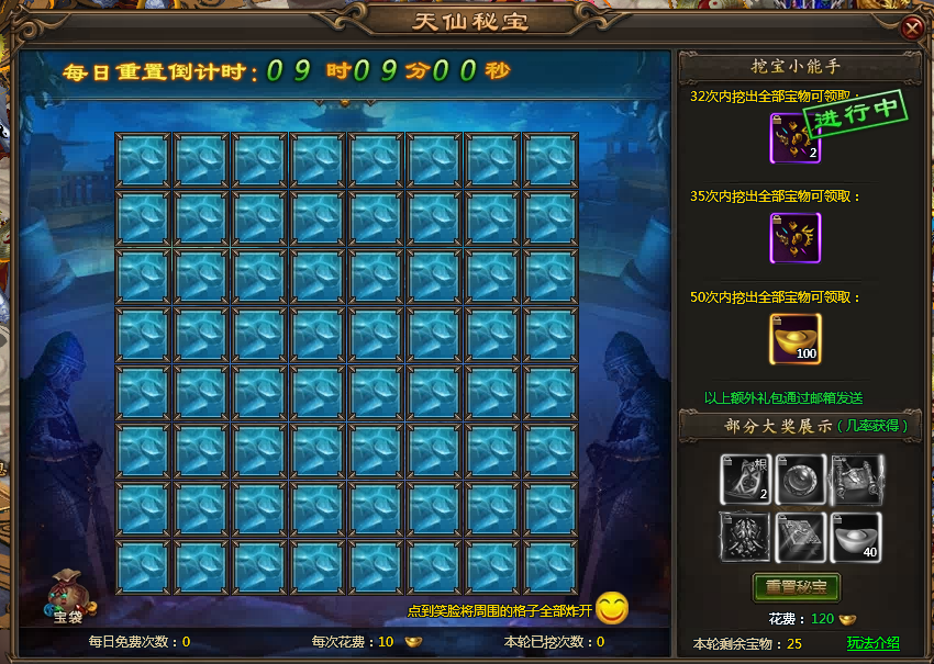 【活动内容】:活动期间,可在活动界面进行挖宝,每日有3次免费次数,挖出所有宝物后可消费元宝进行重置,规定次数内挖出全部宝物还可额外获得奖励