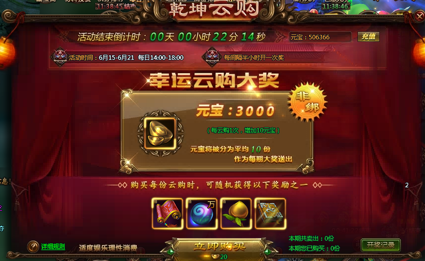 【活动内容】:活动每日14点-18点开启,每半小时开一次奖,每购买一份云购都有概率中,每期的幸运大奖有10份,每份奖励为奖金池内的10分之1的元宝