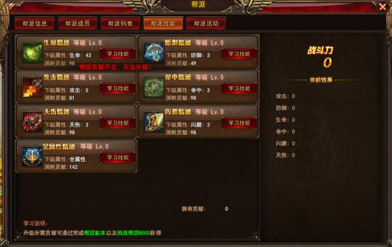 加入帮派自然是好处多多,比如还可以学习帮派技能,从生命、攻击到防御、命中,从天伤、闪避到全属性精通,都是不错的技能价值选择。想要吗?那么接下来的傲天神印王座“帮派副本”和“帮派BOSS”你就不可不看,一定要努力加油拿到贡献数才能不断提升帮派技能喔。