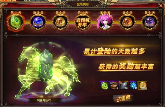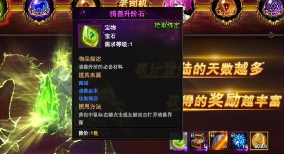 这就是号称第一天最闪耀的“骑兽升阶石”,傲天神印王座中第一天登录可以拿到5枚。虽说不能立马将骑兽升1级,但起码也能对骑兽系统的提升起到一定的作用。