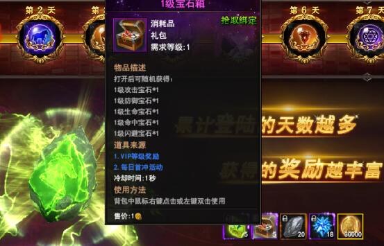 其次是1级宝石箱一共5枚,可以镶嵌在装备上提升各种属性,随机打开可以得到:攻击、防御、生命、命中、闪避等宝石。关于傲天神印王座宝石多补充一句,每日首充可以获得,还有就是VIP等级奖励可拿到。