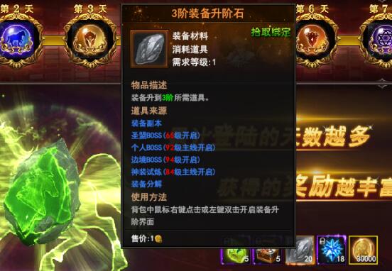 看看后面的三阶装备升阶石,傲天神印王座初级玩家提升到中级的好宝贝。登录第一天就送出20个,开发组也是蛮有气魄的。寻常时候,想要获得它非装备副本、装备分解、圣盟BOSS、个人BOSS、边境BOSS、神装试炼不能获取,一大半的活动都是凶险无比,千万要担心喔。