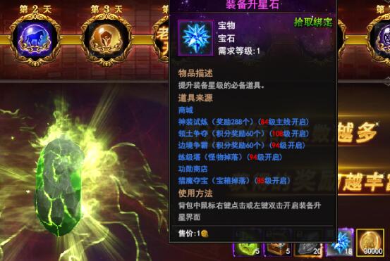 这个应该认识吧,装备升星石,傲天神印王座中仅次于装备升阶石的材料;可以将装备星级属性充分发挥出来,星级越高战斗力越强。还有30000金币就不用我再介绍了吧,看过了第一天奖励,是不是很眼馋呢?别急,后面还有更好的,比如老司机头衔等。