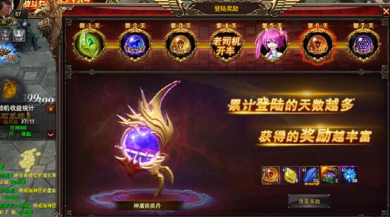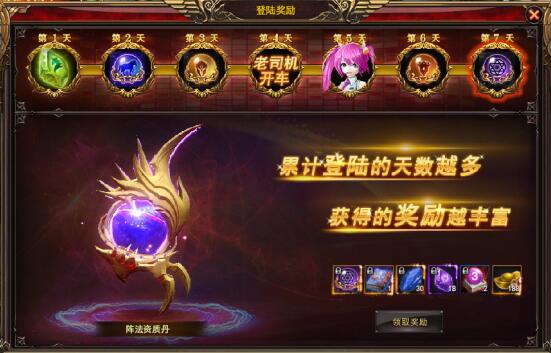 这就是第二日的奖励,许多材料比如3倍经验丹我们一下就能感知出来,前面第一个会不会是经验直升丹呢?还有装备升阶石、书籍等,想了解真相就一定要勤劳登录喔。
