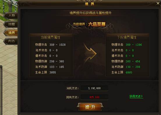 开启境界功能后,玩家可以通过消耗经验来获得灵液,有能力的玩家可以通过直接购买灵液。当拥有足够的灵液之后,玩家可以消耗灵液进行境界提升,踏入更高层次的至尊境界。