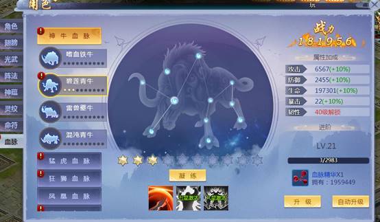 血脉通过搜集对应的血脉材料激活,激活后获得大量属性,可对血脉进行升级及凝练,升级到指定等级可解锁新属性,凝练到指定星级可激活血脉技能;材料通过玩法仙域之地获得;