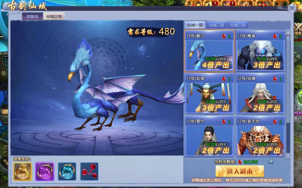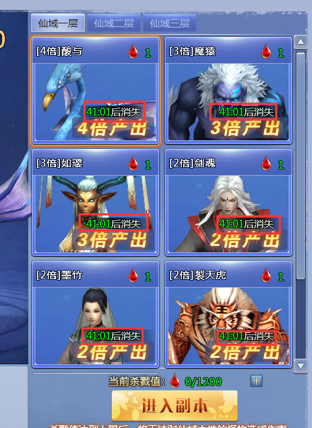 ●满足等级要求才能进入对应的层数:第一层需要480级,第二层需要800级,第三层需要仙君1.