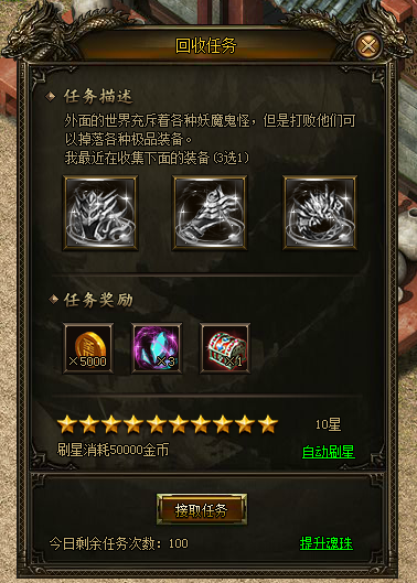 装备回收任务每天每人最多可做3次,每次会有3种需要回收的装备,玩家可根据自己的条件选择其中一种进行提交。任务划分星级,最高为10星,刷到星级越高,最后产出的奖励也就越好。如果想要获得回收宝箱,则需要每次都要刷新到10星才能,否则只能获得圣妖币和魂珠碎片等物品。