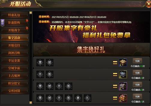 活动期间内,玩家击杀boss可掉落文字卡片,收集对应的文字组合即可领取免费礼包