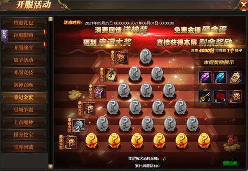 活动期间内,每消费满4000钻石即可领取1个金锤,消耗金锤可随机砸出丰富道具。砸到本层幸运大奖直接获得本层所有剩余奖励!