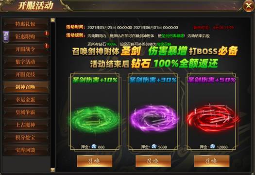 活动期间内,抵押钻石即可召唤剑神附体,使圣剑伤害暴增!活动结束后返还所有钻石100%,低级召唤可补差价转为高级召唤