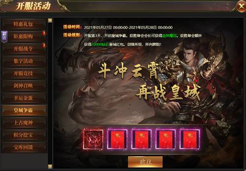 开服第3天,开启皇城争霸。获胜帮会会长可获得血煞魔冠。获胜帮会额外获得20000钻石皇城红包!