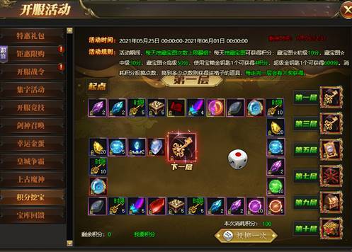 消耗积分投掷点数,掷到多少点则获得该格子的道具,每走完一层必定获得本层大奖