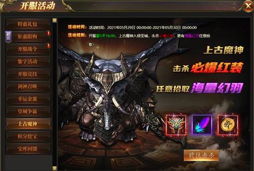开服第5天16:00,上古魔神入侵圣城,击杀必爆红装,更有海量幻羽任意拾取
