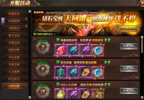 活动期间内,在充值宝库寻宝达指定次数可免费领取海量神装道具