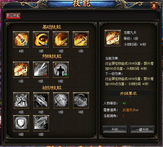 技能分为职业技能、怒气技能、被动技能。