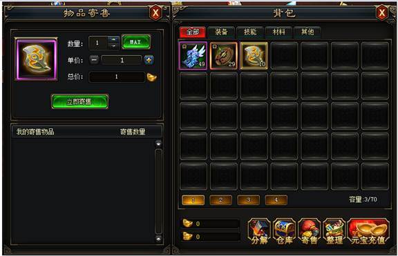 5、每个玩家最多可寄售10个物品,物品寄售时间为24小时,24小时后如果还没有卖出去系统则会帮你放到寄存处保管,介时请自己去找NPC【寄售商人】流通领回。